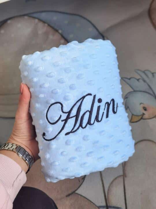 Minky dekica se radi od predivnog plišanog materijala. Sa obje strane je isti materijal i po želji na jednoj strani radimo vez imena. Vez imena je besplatan. Dovoljno je u napomenu, prilikom popunjavanja podataka, upisati ime djeteta.