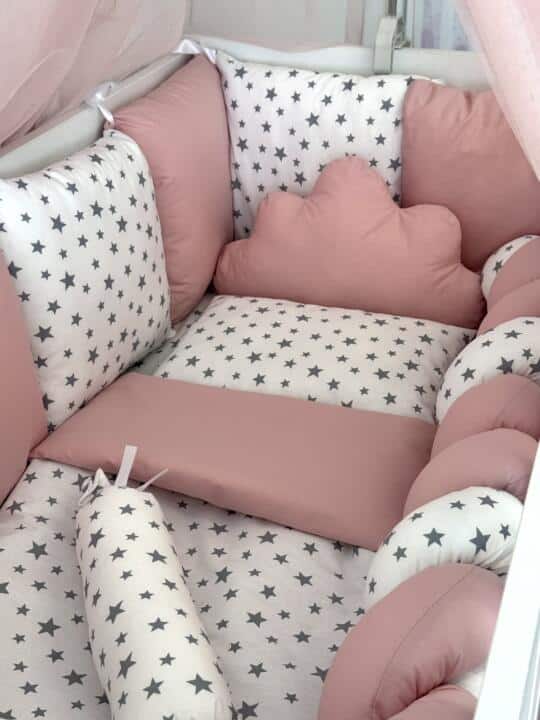 Ogradica sa tri strane sa čipkom, pletenica, jastuk, jorgan, plahta i dva ukrasna jastuka.
