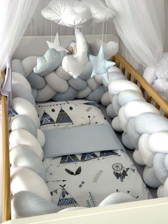 • Velvet pletenica sa četiri kraka, u dužini 360cm, i visini 30cm. Dužina 360cm odgovara standardnom krevetiću 120x60cm, ili ovalnom krevetiću u drugoj fazi. A iskoristiva je i u velikom krevetu kasnije.