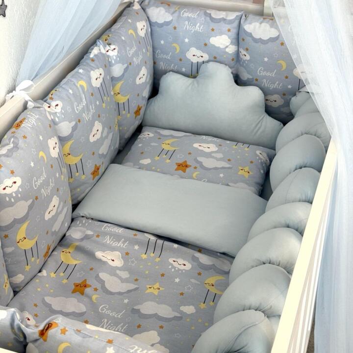 Set Bumper Good Night Plava – Ogradica sa tri strane, pletenica, plahta, jastuk, jorgan i dva ukrasna jastuka – 120x60cm