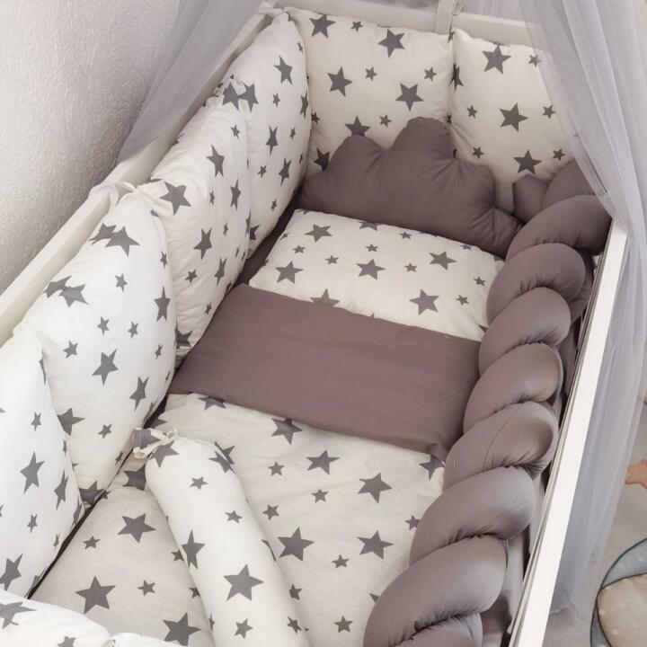 Set Bumper Tamno Siva i Velike Sive Zvijezde – Ogradica sa tri strane, pletenica, plahta, jastuk, jorgan i dva ukrasna jastuka – 120x60cm