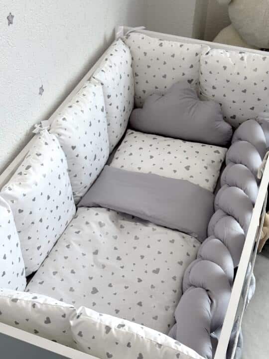 Set Bumper Srebrena Srca i Siva – Ogradica sa tri strane, pletenica, plahta, jastuk, jorgan i dva ukrasna jastuka
