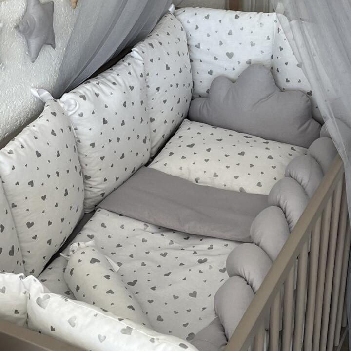 Set Bumper Svijetlo Siva i Srebrena Srca – Ogradica sa tri strane, pletenica, plahta, jastuk, jorgan i dva ukrasna jastuka – 120x60cm