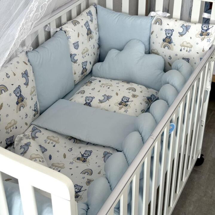 Set Bumper Svijetlo Plava i Medo na Dugi – Ogradica sa tri strane, pletenica, plahta, jastuk, jorgan i dva ukrasna jastuka – 120x60cm