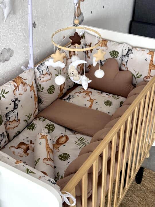 Set Bumper Bež Safari i Smeđa – Ogradica sa tri strane, pletenica, plahta, jastuk, jorgan i dva ukrasna jastuka