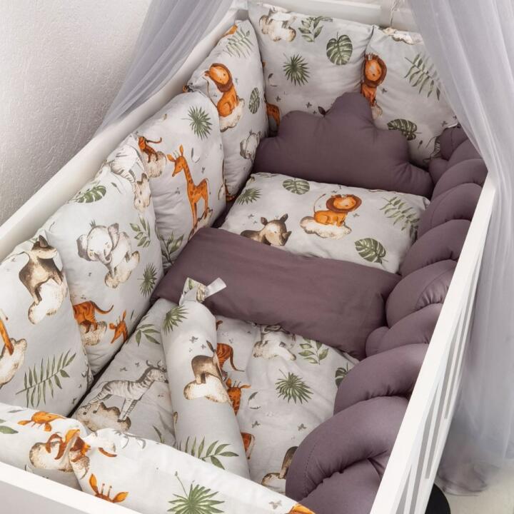 Set Bumper Sivi Safari i Tamno Siva – Ogradica sa tri strane, pletenica, plahta, jastuk, jorgan i dva ukrasna jastuka – 120x60cm