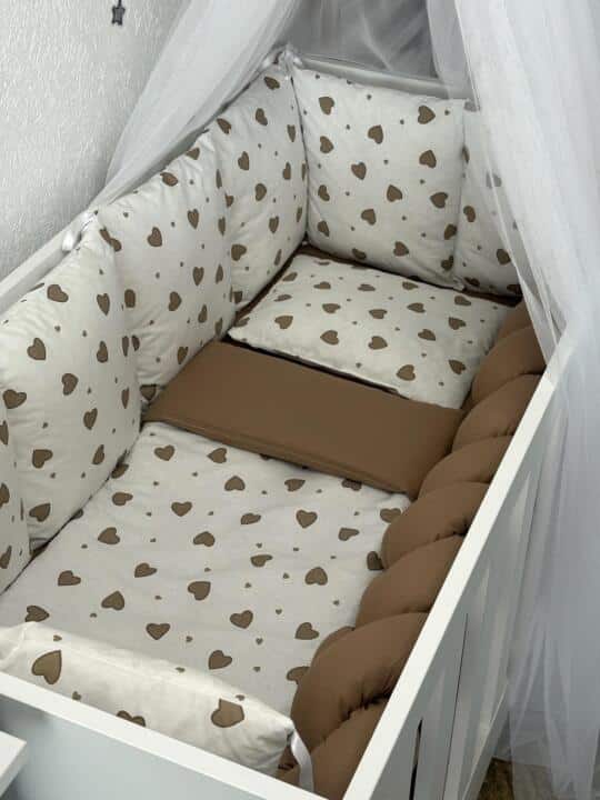 Set Bumper Smeđa i Smeđa Srca – Ogradica sa tri strane, pletenica, plahta, jastuk, jorgan i dva ukrasna jastuka