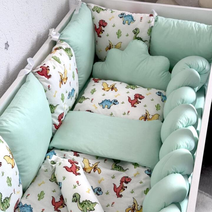 Set Bumper Mint Dinosauri – Ogradica sa tri strane, pletenica, plahta, jastuk, jorgan i dva ukrasna jastuka – 120x60cm