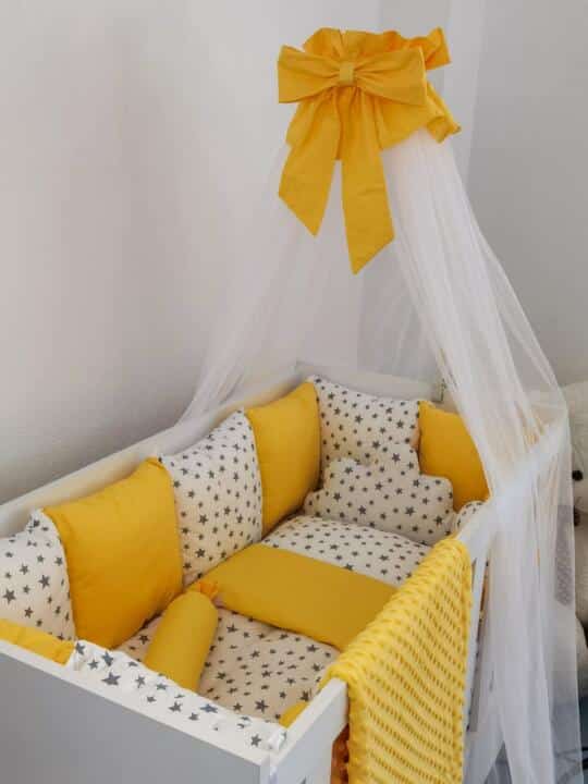 Set Bumper Žuta i Bijela sa Sivim Zvjezdicama – Ogradica sa tri strane, pletenica, plahta, jastuk, jorgan i dva ukrasna jastuka