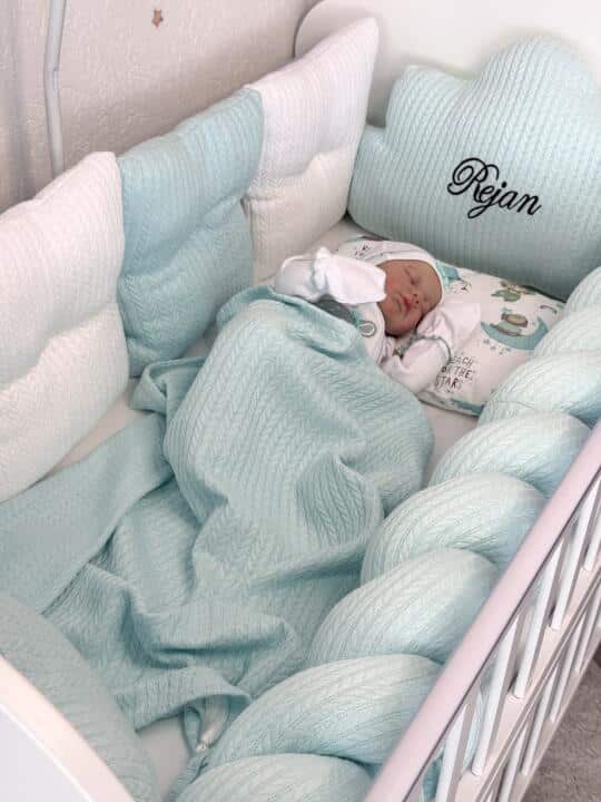 Najnježniji set za krevetac – Visoko kvalitetna ogradica sa tri strane, pletenica, jastuk, plahta i dekica.