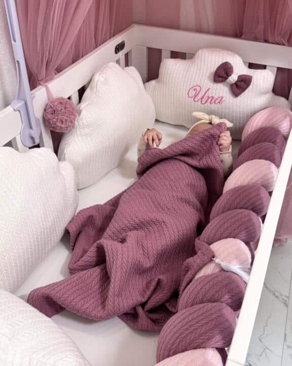 Najnježniji set za krevetac – Visoko kvalitetna ogradica sa tri strane, pletenica, jastuk, plahta i dekica.
