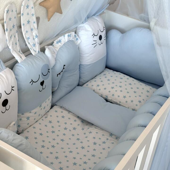 Set Vesela družina Svijetlo Plava sa Plavim zvjezdicama – ogradica sa tri strane pletenica, plahta, jastuk, jorgan – 120x60cm