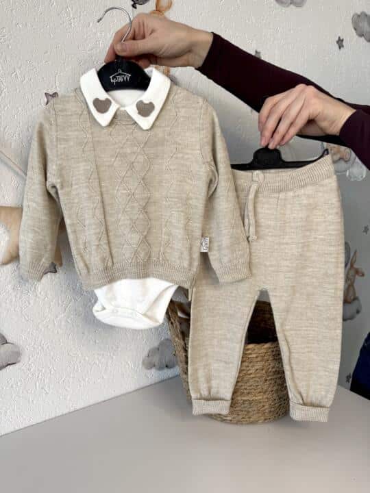 Set Pleteni džemper, pletene hlače i bodi – Bež