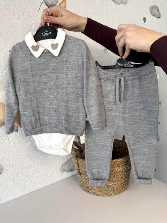 Set Pleteni džemper, pletene hlače i bodi – Siva