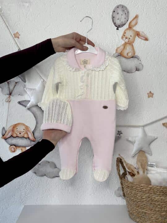 SET Pleteni pamučni kombinezon sa čipkom i kapica – Roze Bijela