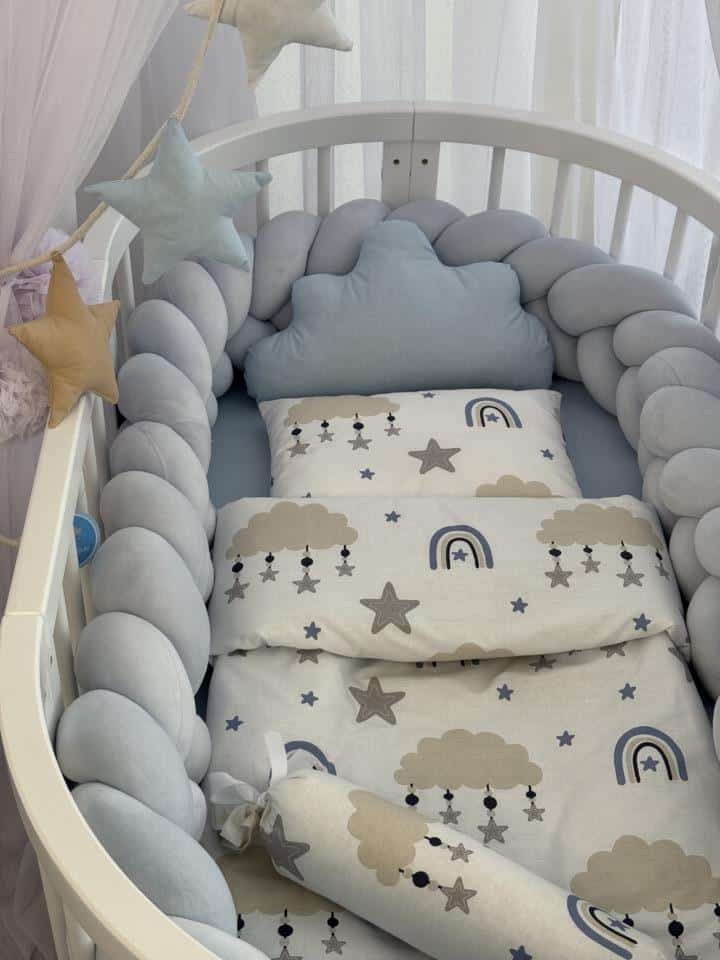 • Velvet pletenica sa tri kraka, u dužini 360cm, i visini 15cm. Dužina 360cm odgovara standardnom krevetiću 120x60cm, ili ovalnom krevetiću u drugoj fazi. A iskoristiva je i u velikom krevetu kasnije.
